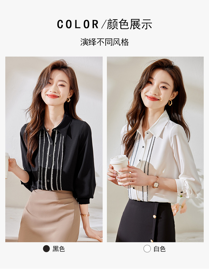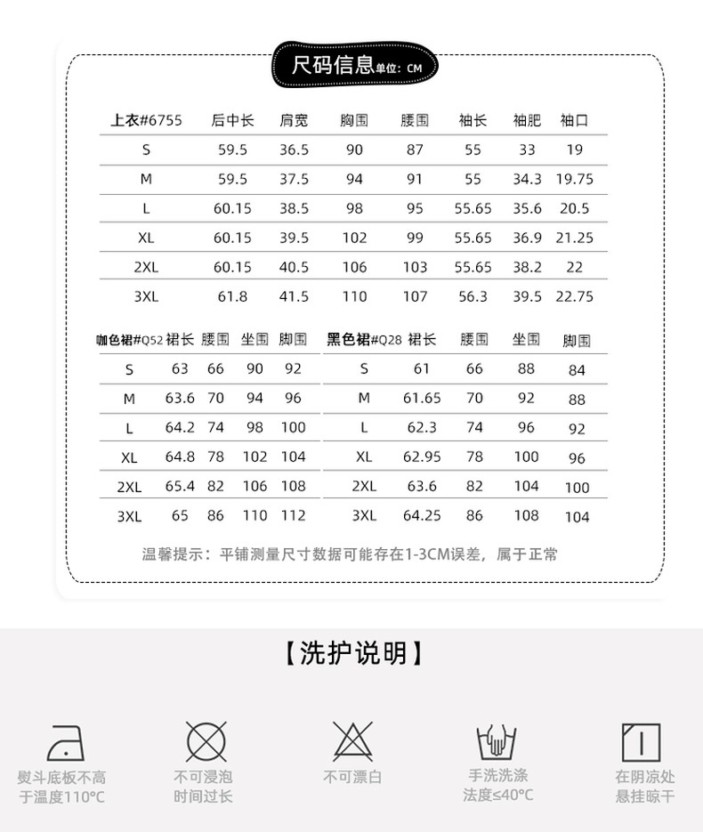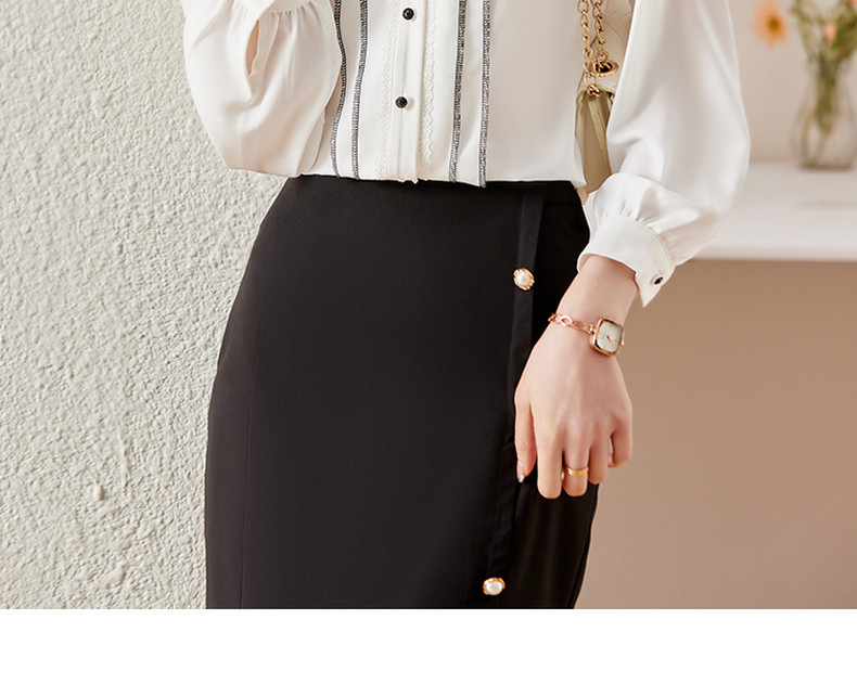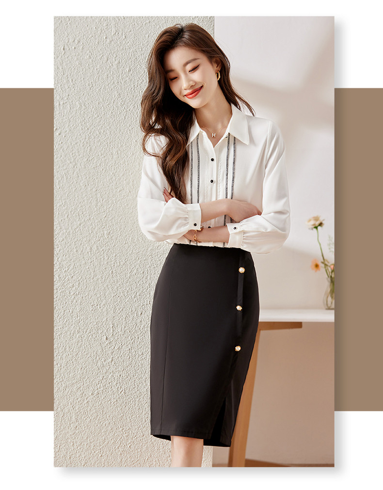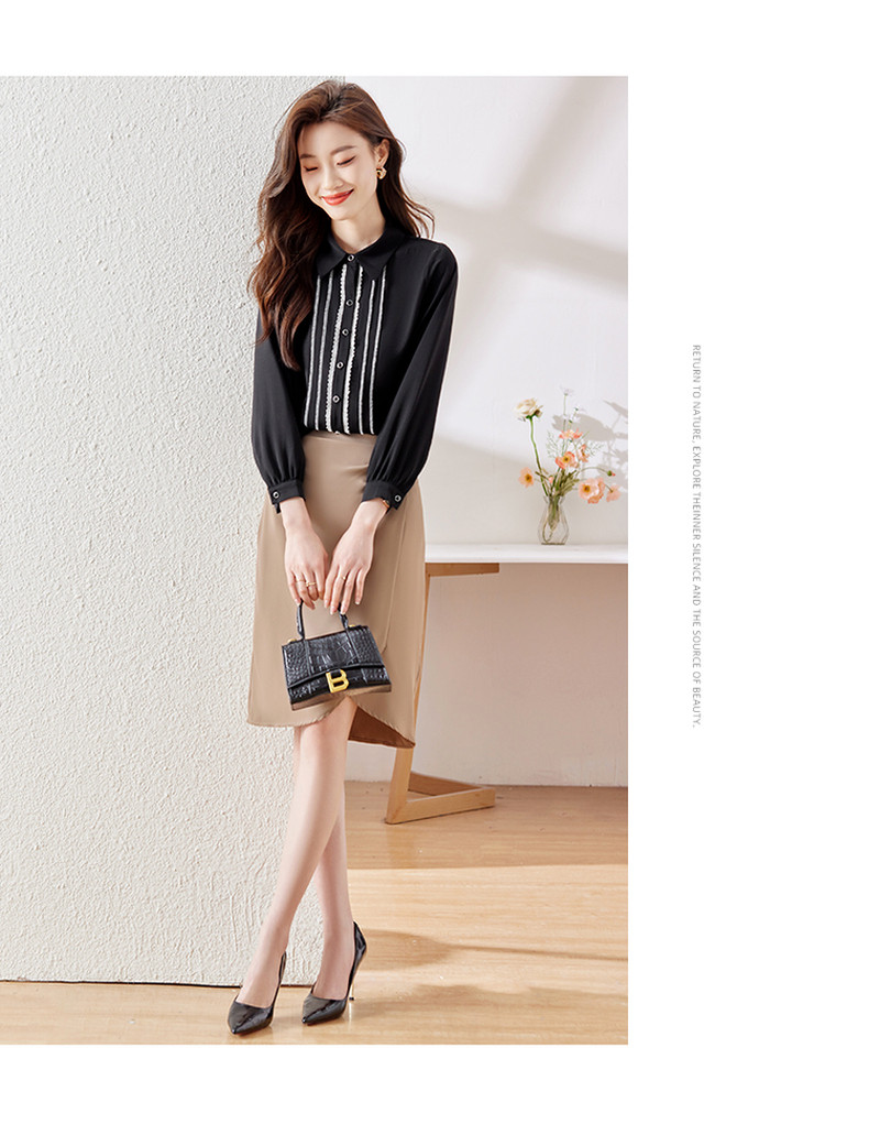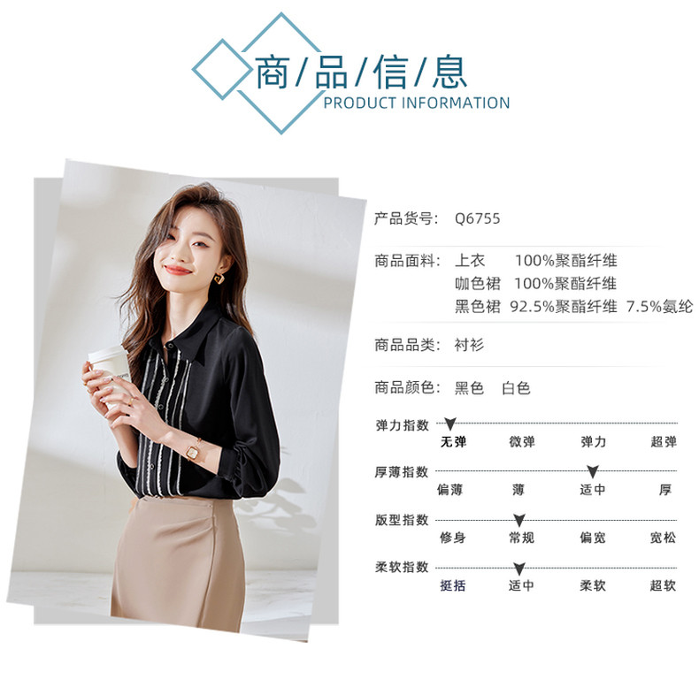 - 颜色:单件白色衬衫,单件黑色衬衫,白色衬衫+黑色半身裙,黑色衬衫+咖啡色半身裙