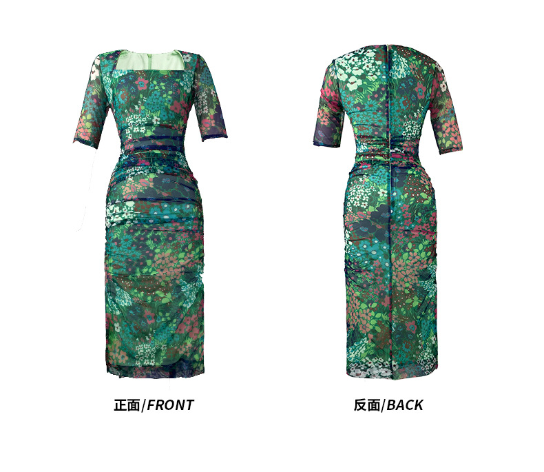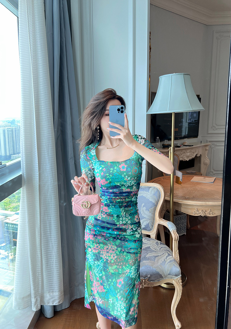 C-1019# 衣服2022夏季新款跨境女装优雅气质方领碎花开叉连衣裙修身10104