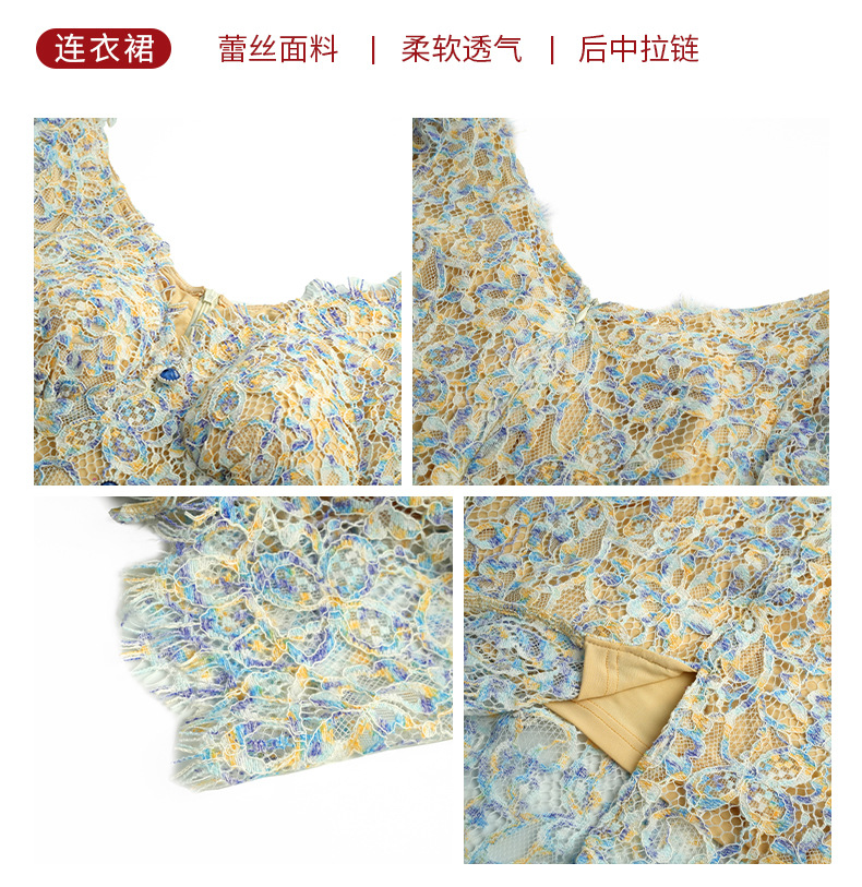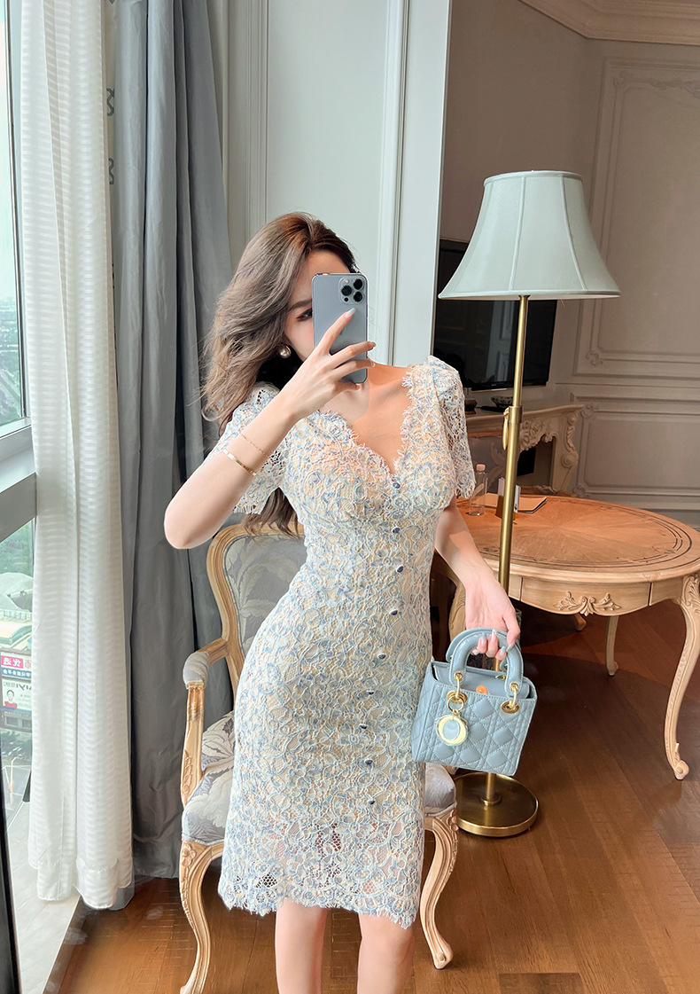 C-1011# 2022 夏季新款恋综女主温柔风气质V领单排扣蕾丝修身连衣裙10110