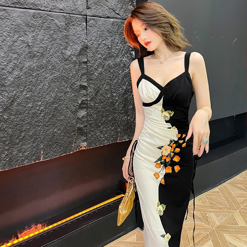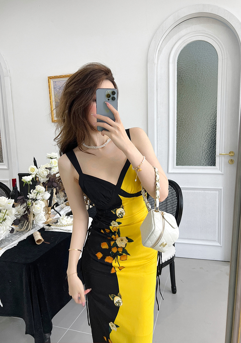 C-1096# 2022夏季新款女装法式复古 V字领撞色印花修身包臀吊带连衣裙5922