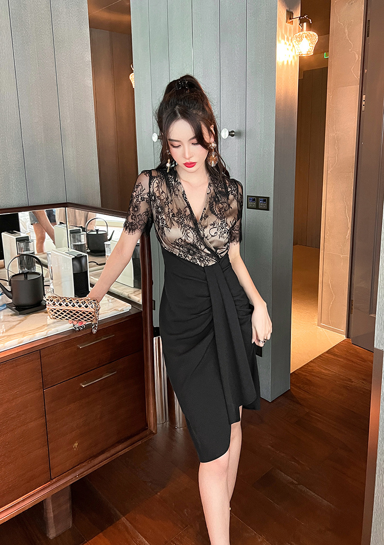 C-1153# 2022夏季新款韩版女轻熟风气质蕾丝V字领修身遮腹褶皱连衣裙5816