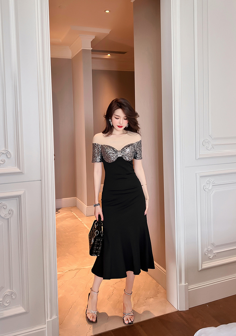 C-1157# 2022夏季新款设计感女人味修身鱼尾亮片连衣裙法式礼服长裙10119