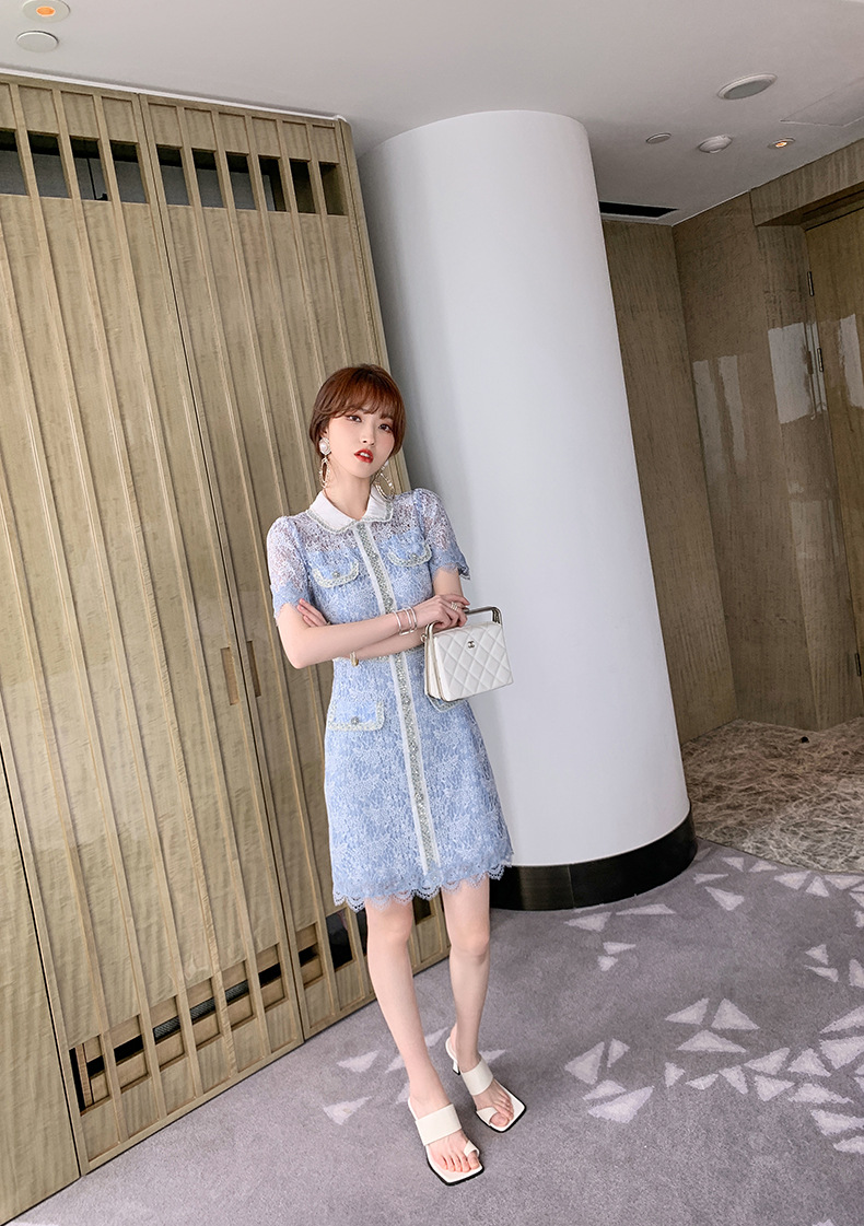C-1183# 洋气小香名媛风蕾丝连衣裙2022夏季女重工设计感钩花镂空裙子5043