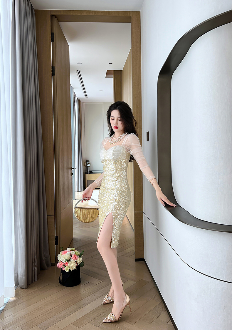 C-2002# 2022秋季新款名媛风气质网纱拼接亮片修身连衣裙甜美礼服裙20161
