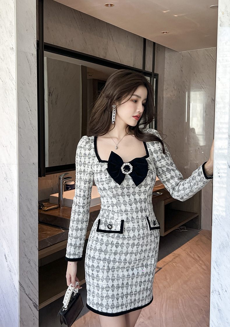 C-2014# 2022秋装新款女小香气质蝴蝶结减龄针织呢子格纹包臀连衣裙10164