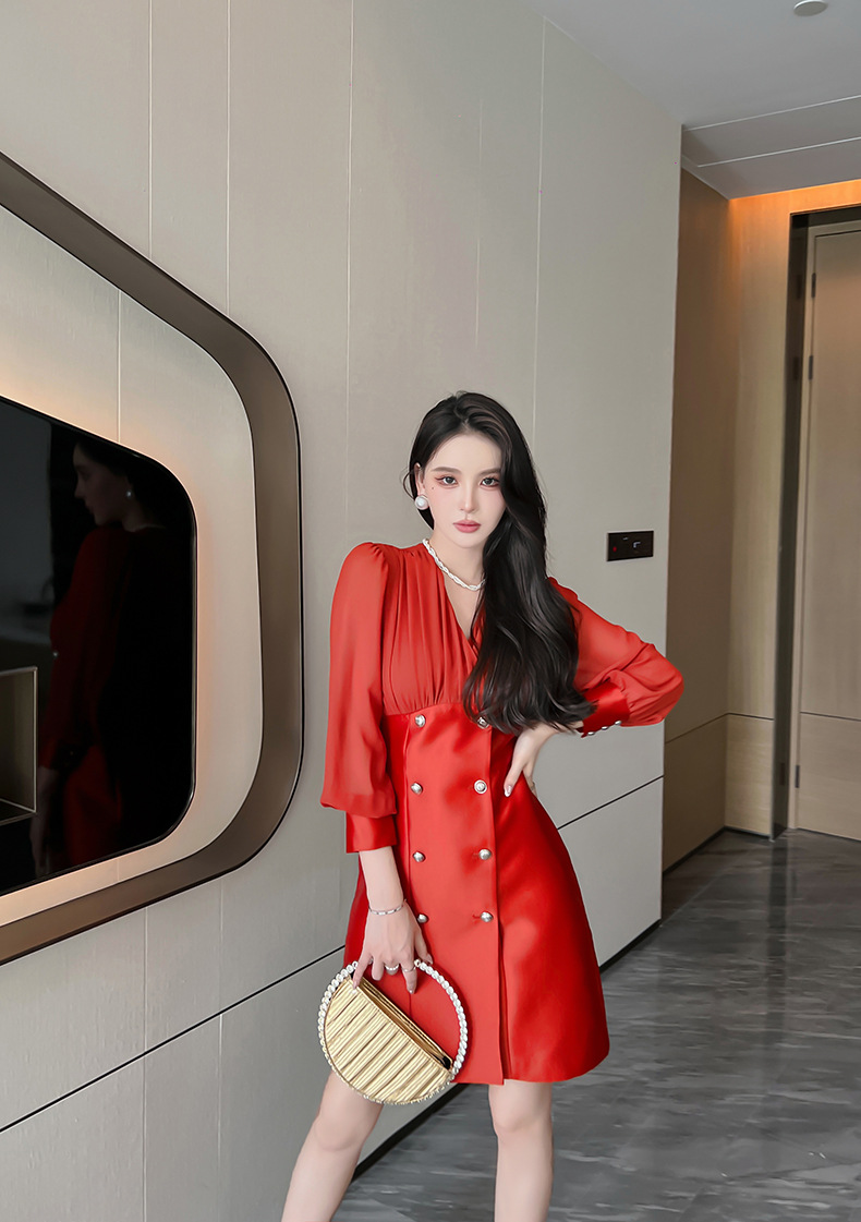 C-2127# 御姐风气质黑色连衣裙女2022秋季V领褶皱收腰遮腹设计感裙子5967