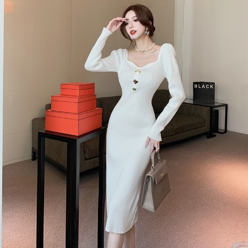 O-1302# 气质修身针织连衣裙女秋冬2022新款打底一步方领包臀长裙高级名媛