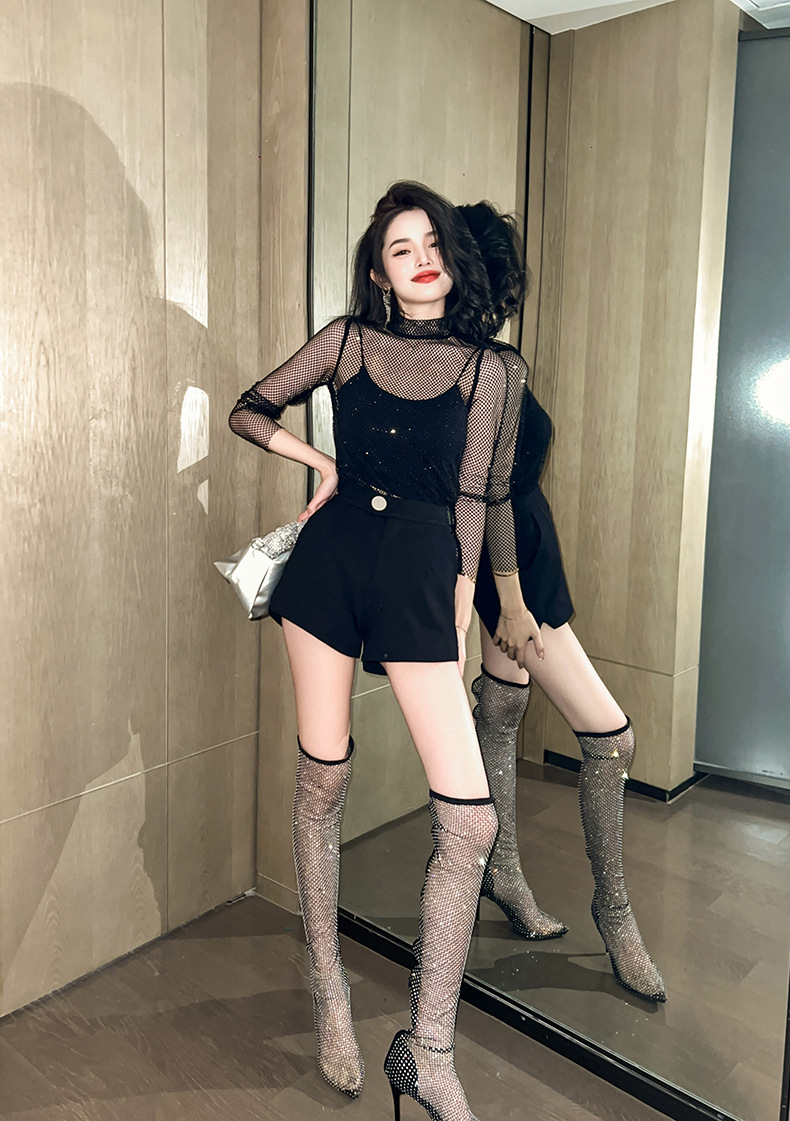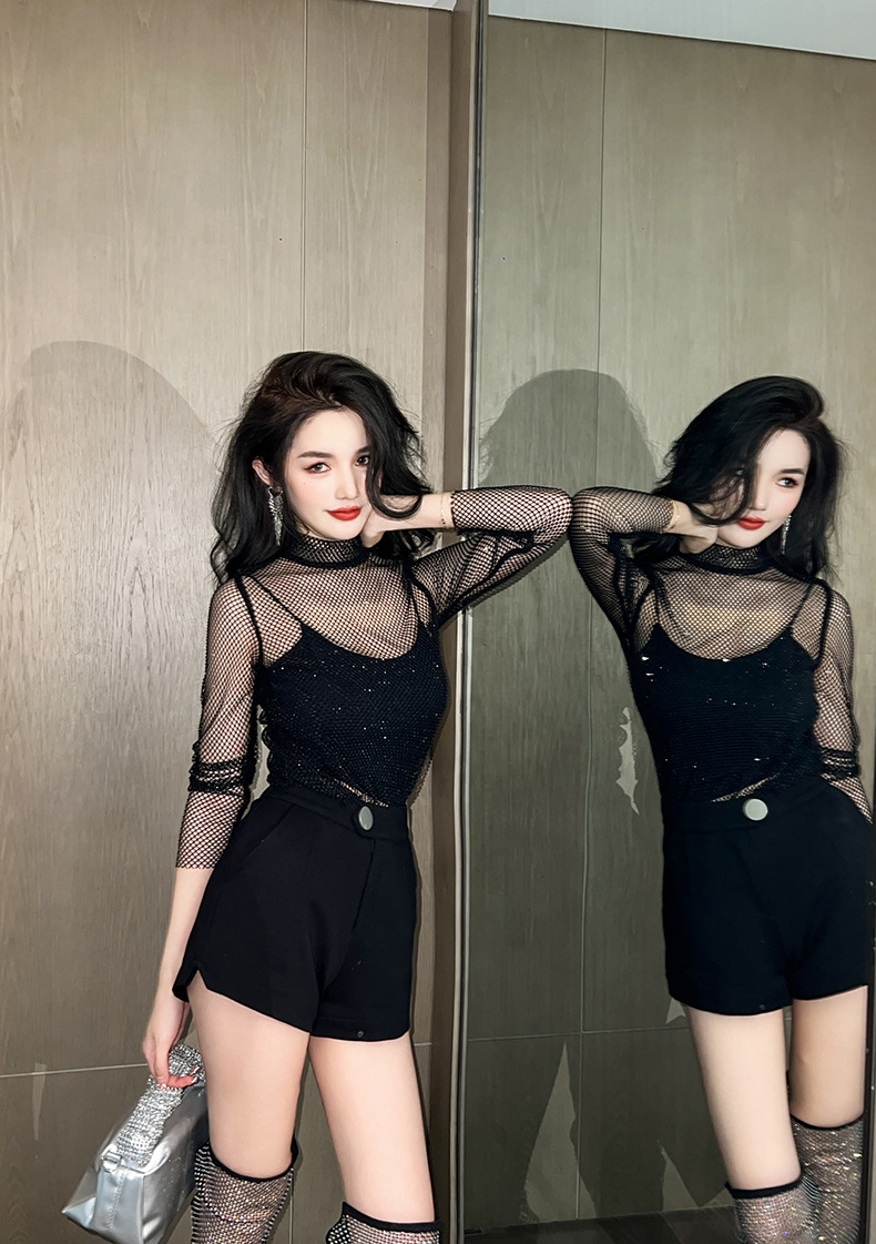 C-2262# 2023春装新款女装透视网纱镂空罩衫蹦迪夜店蹦迪闪闪真空上衣6180