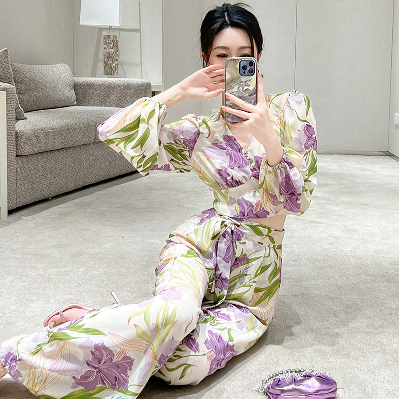C-2407# 郁金香套装2023夏季灯笼袖上上衣高腰阔腿裤长裤印花两件套50190