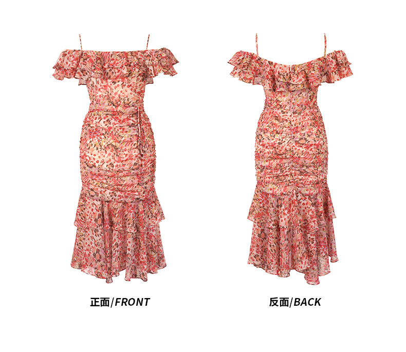 C-2717# 2023夏季新款女装法式一字领荷叶边褶皱修身碎花鱼尾连衣裙30521