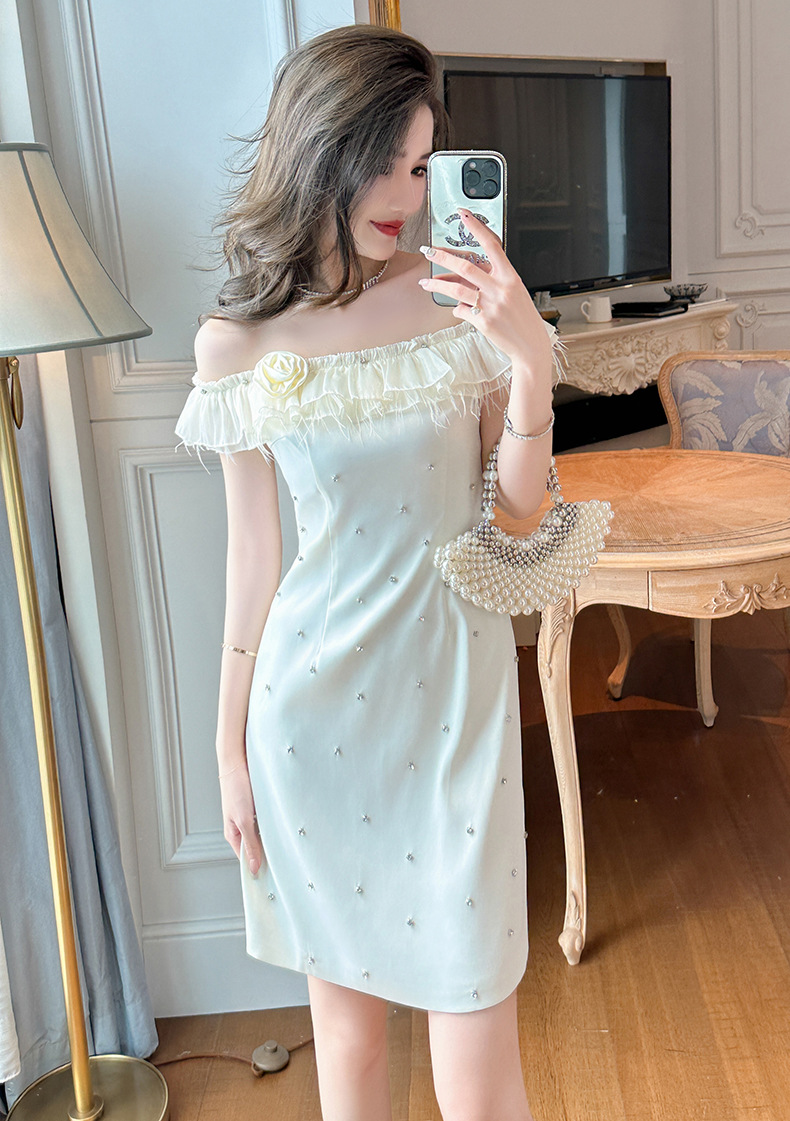 C-2726# 2023夏季新款女装法式一字领露肩花朵镶钻小个子A字摆连衣裙50328