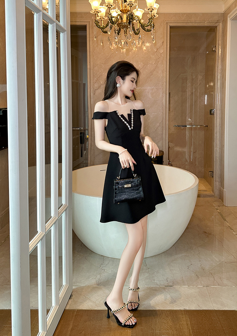 C-2730# 设计感小个子赫本风裙子2023夏季新款抹胸一字领收腰连衣裙10768