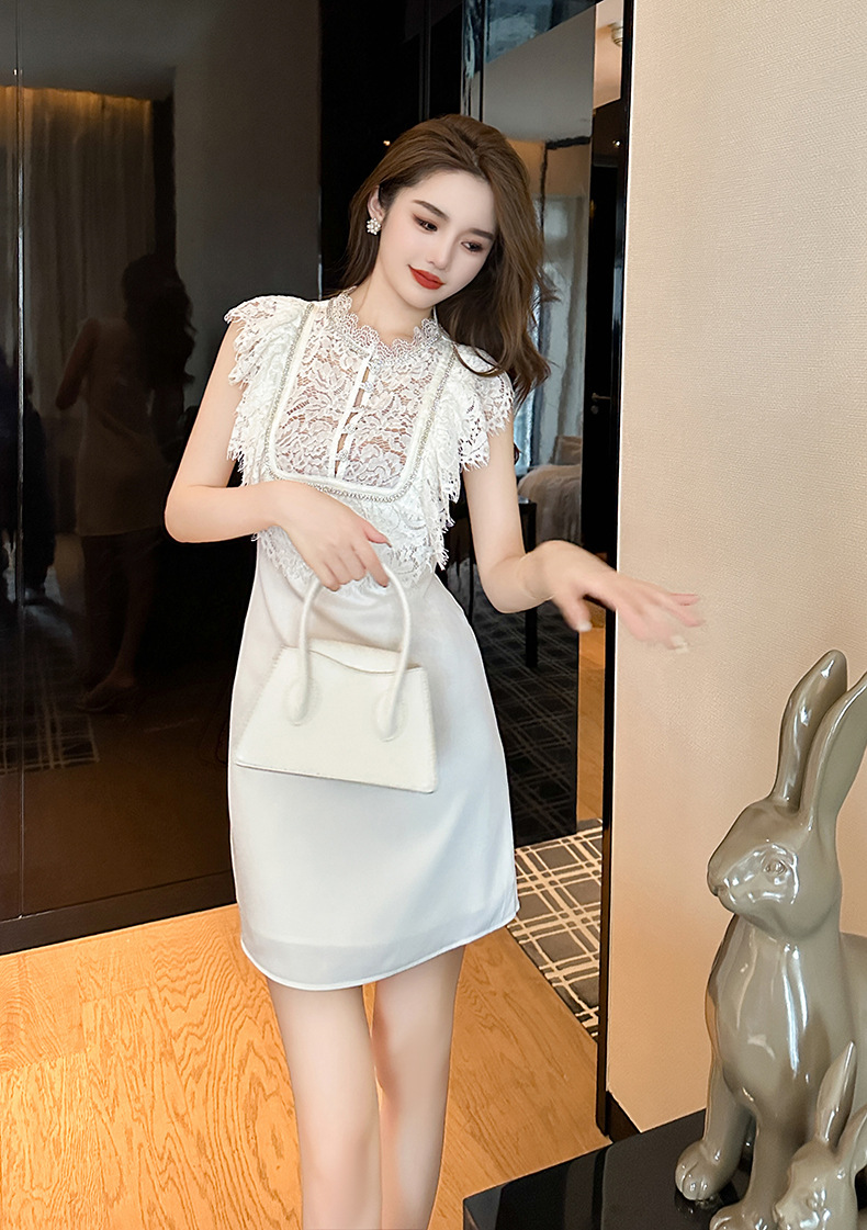 C-2742# A字礼服裙2023夏季新款名媛气质镶钻蕾丝边收腰白色连衣裙90191