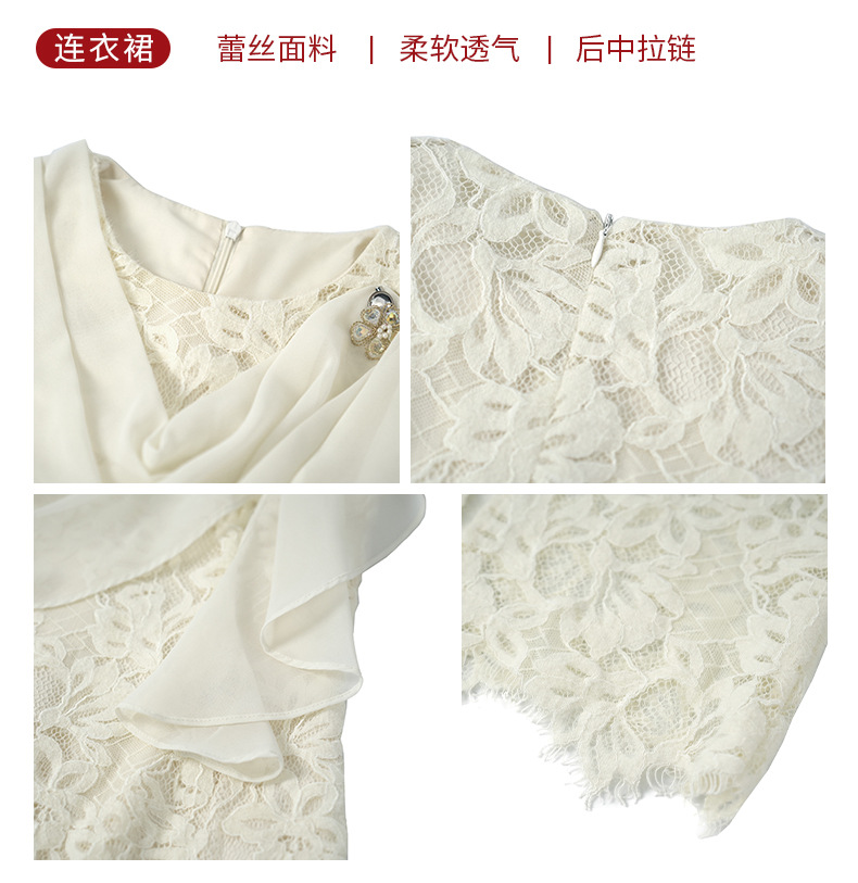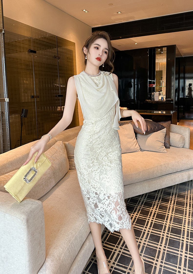 C-2744# 2023夏季新款女装法式气质雪纺拼接荡领修身背心蕾丝连衣裙10749