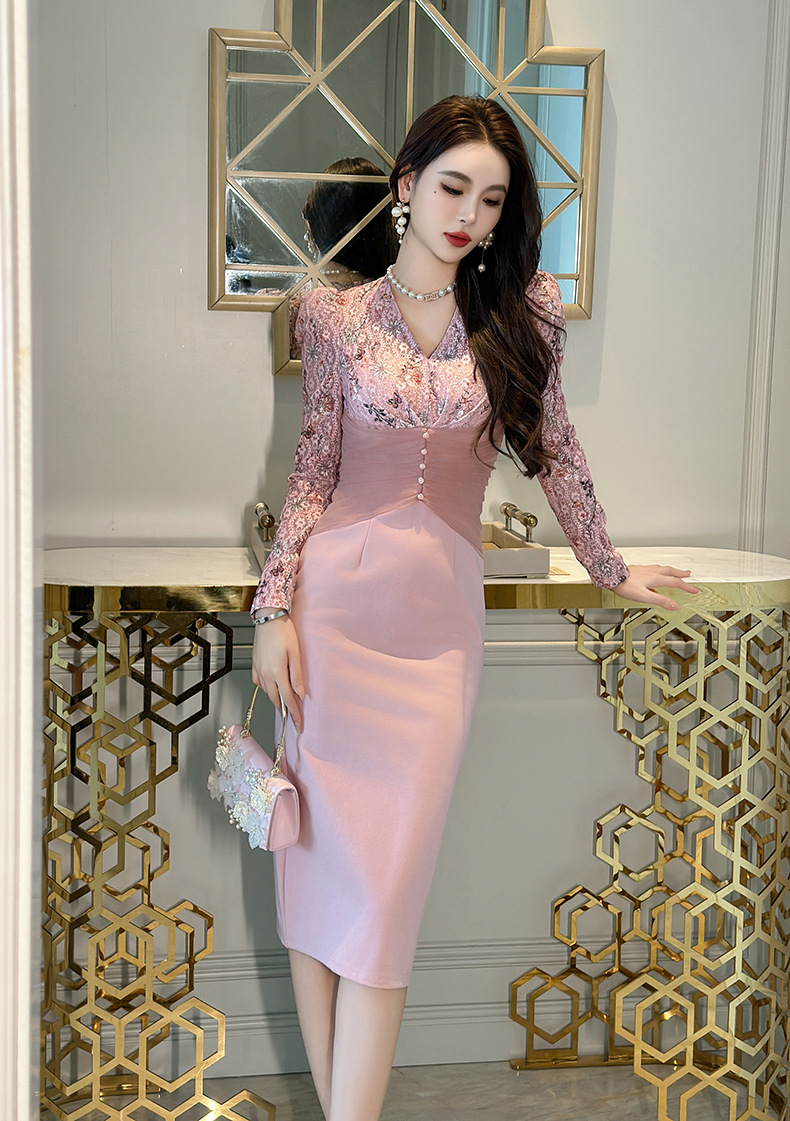 C-2987# 2023秋冬装新款优雅气质蕾丝拼接收腰包臀连衣裙显瘦长裙女50535