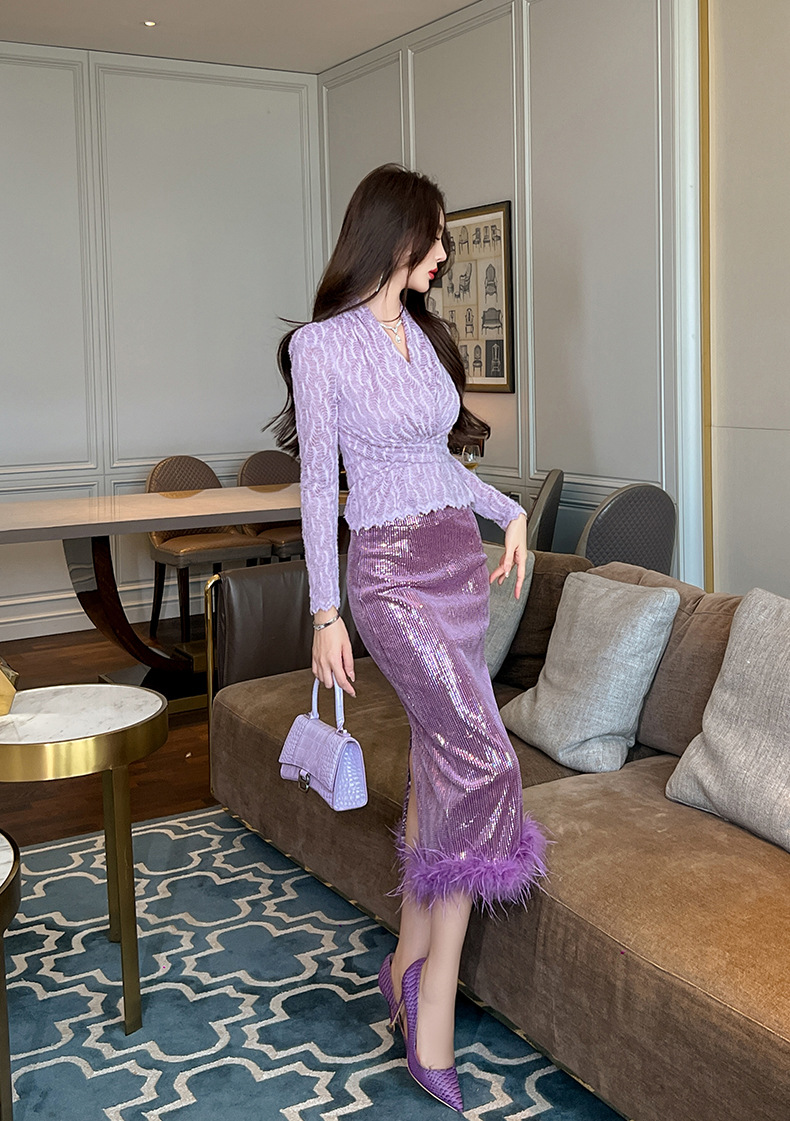 C-2990# 2023秋冬装新款女装法式V领褶皱修身显瘦蕾丝衫系带收腰上衣20934