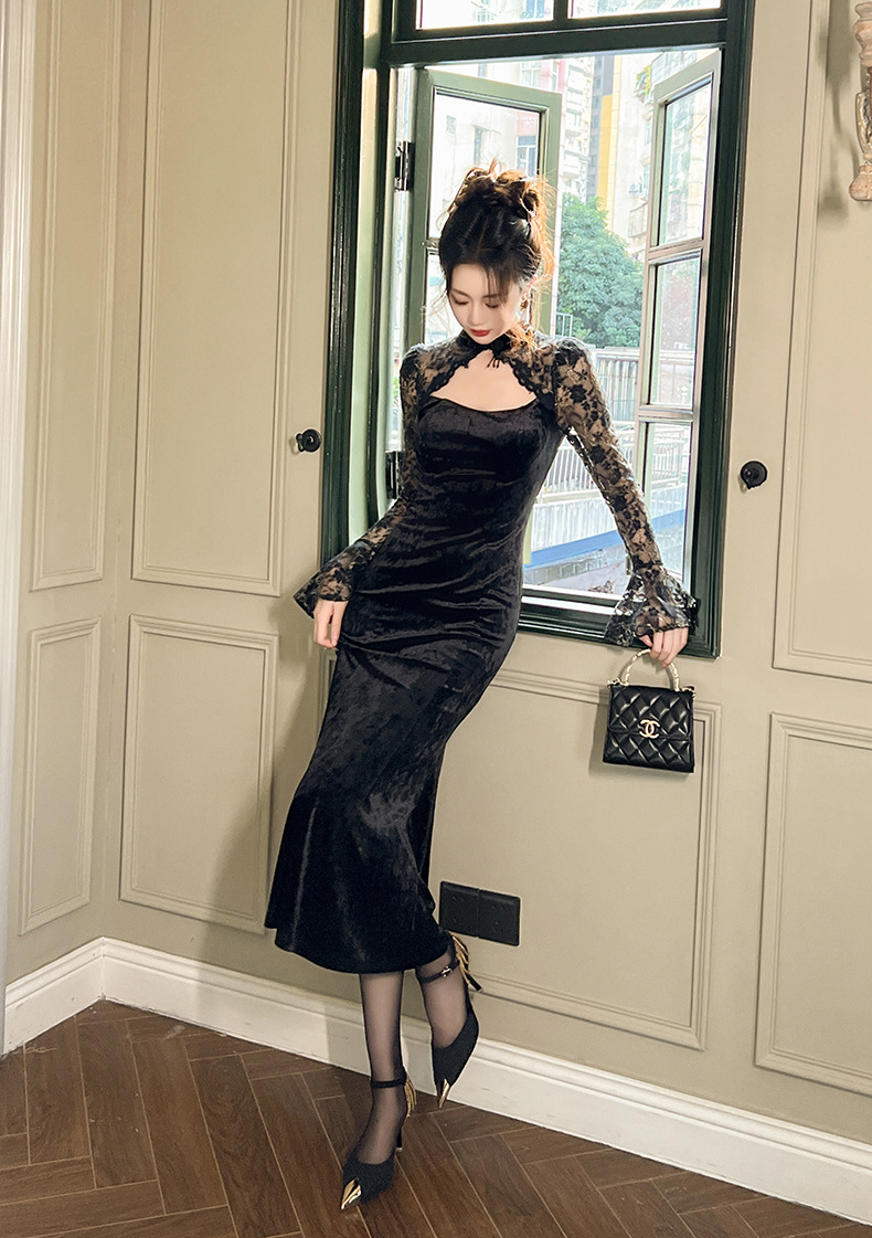 C-3016# 2023秋冬装新中式改良旗袍连衣裙中国风喇叭袖修身丝绒长裙20961