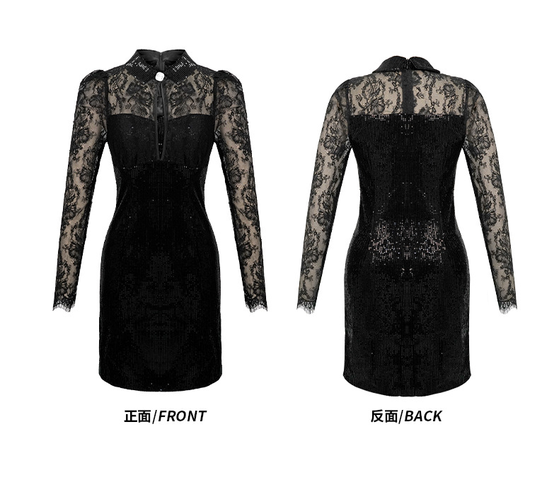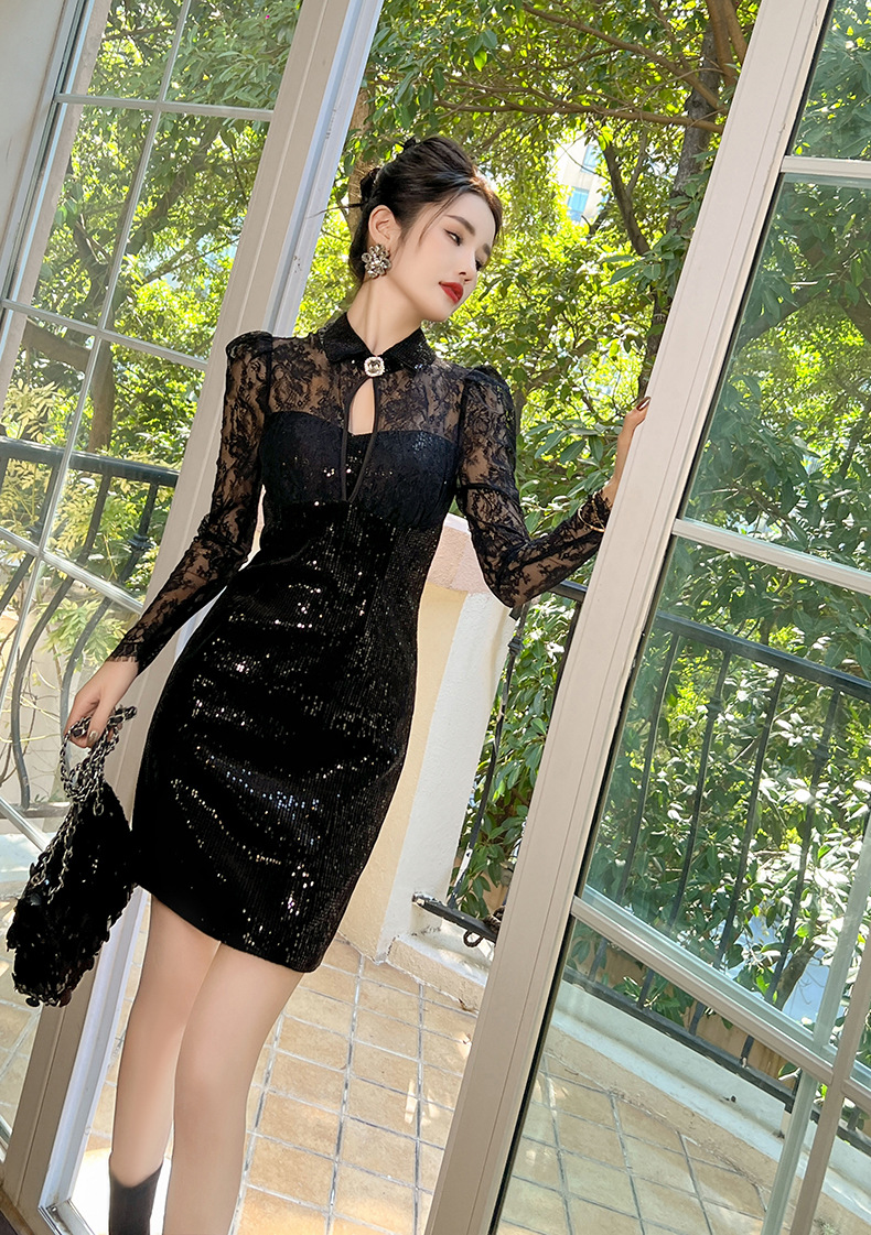 C-3045# 生日派对小黑裙2023秋冬装名媛蕾丝包臀连衣裙女亮片礼服裙21018
