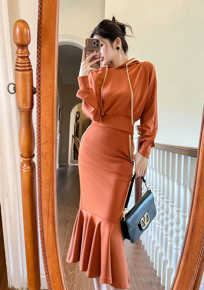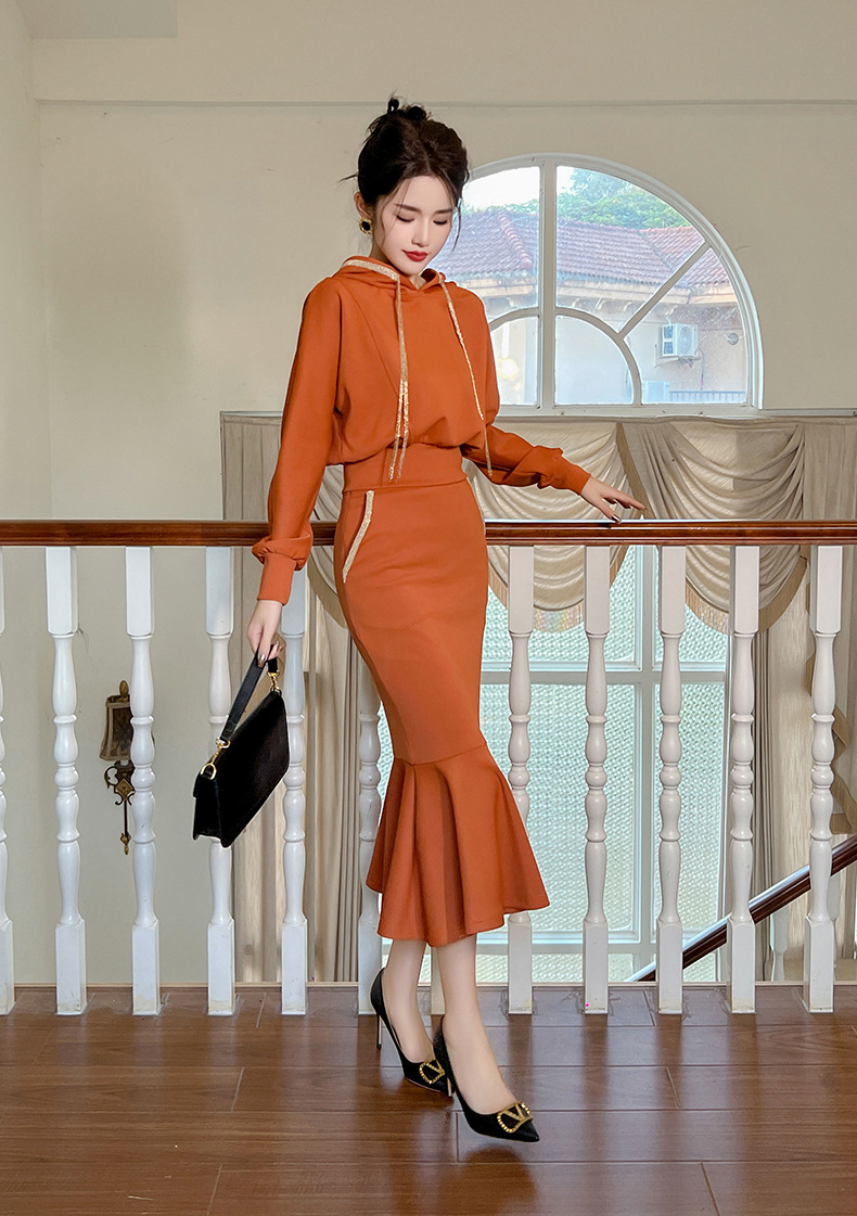 C-3052# 2023秋冬装新款女装休闲气质连帽卫衣高腰包臀鱼尾裙两件套30713