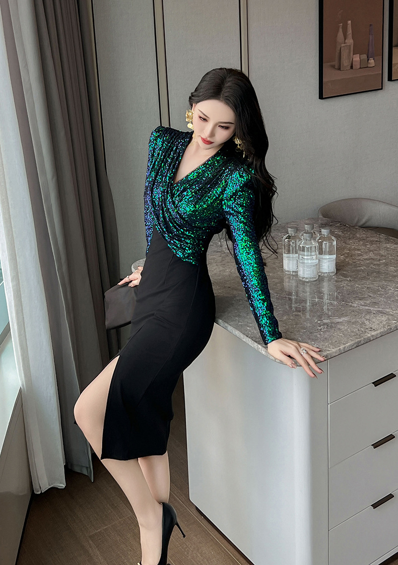 C-3155# 年会礼服裙2024春装新款女装设计感亮片拼接修身包臀连衣裙30757