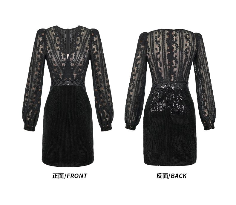 C-3166# 晚礼服裙2024春装新款法式设计感蕾丝拼接亮片假两件连衣裙20919