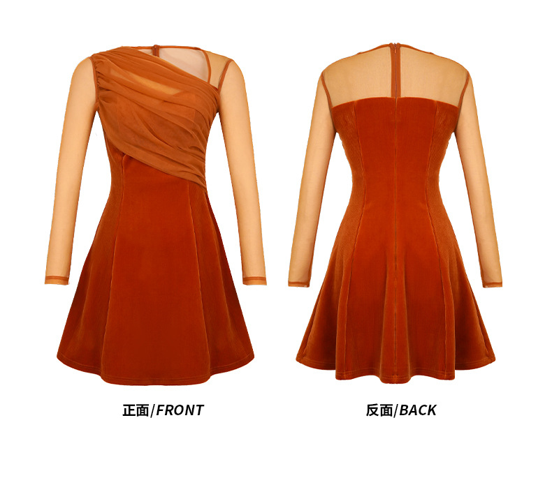 C-3169# 2024春装新款女法式性感网纱拼接斜肩收腰显高丝绒A字连衣裙11268