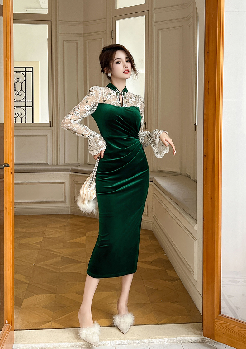 C-3179# 新中式改良旗袍裙2024春装新款蕾丝喇叭袖修身丝绒连衣裙20962