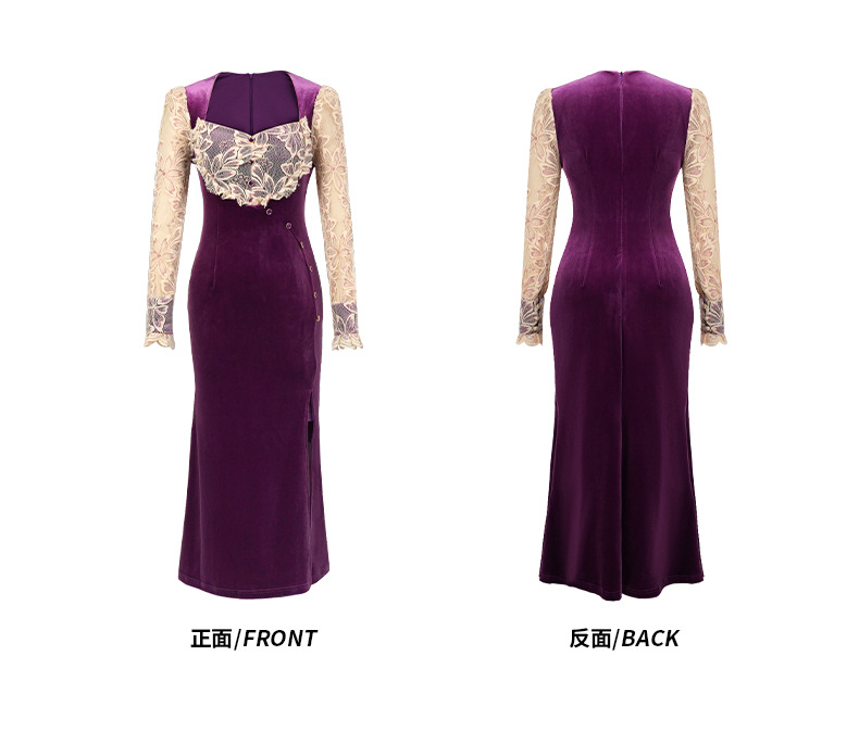 C-3186# 千金穿搭2024春装新款法式方领蕾丝拼接修身开叉丝绒连衣裙20985