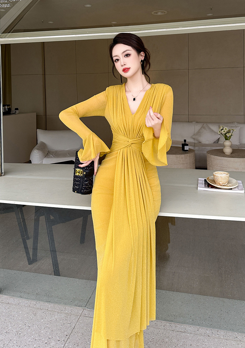 C-3200# 2024春装新款女法式设计感扭结设计感喇叭袖修身长款连衣裙21105