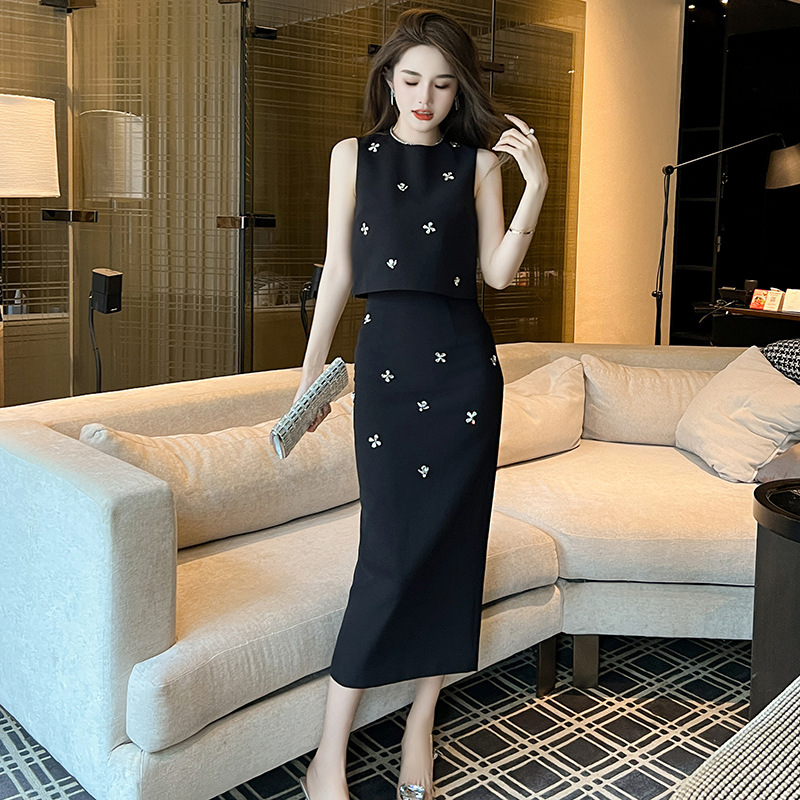 C-3206# 时尚套装裙2024夏季新款法式镶钻背心上衣高腰半身裙两件套30546