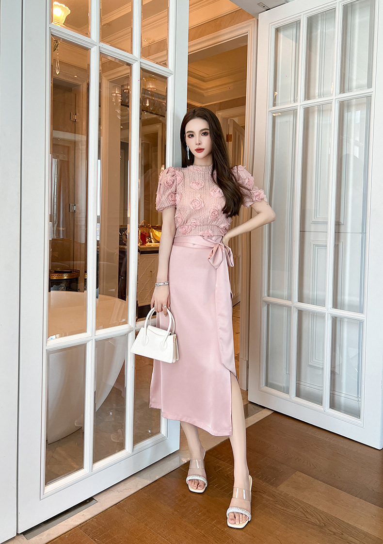 C-3213# 设计感立体花朵针织衫2024新款女装法式泡泡袖粉色短款上衣50120