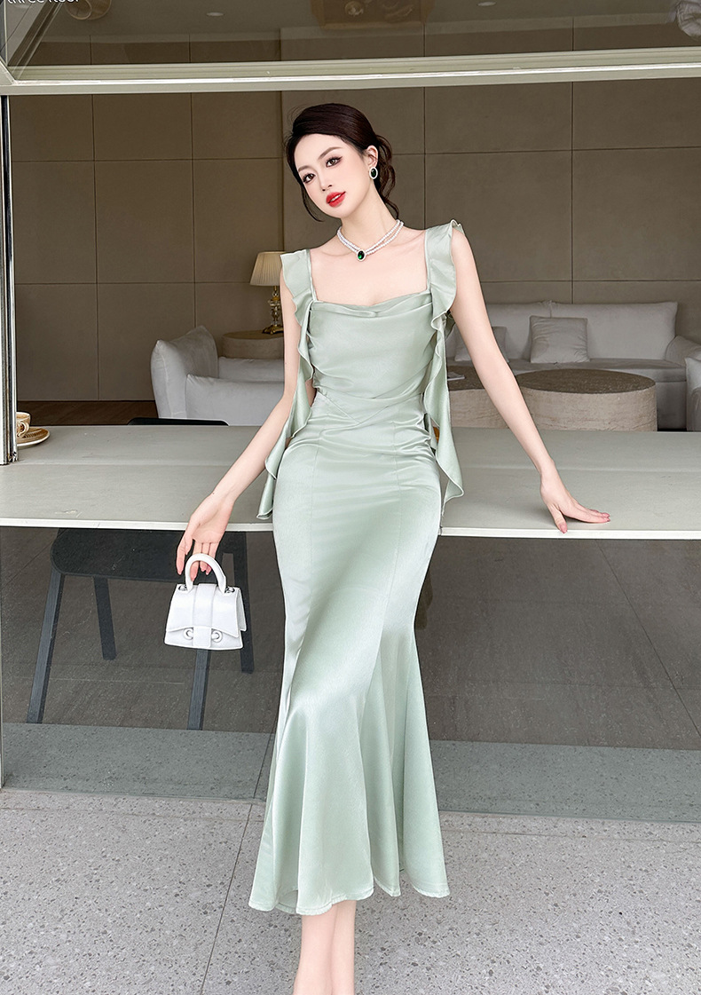 C-3234# 长款修身鱼尾裙2024夏季新款女法式温柔风方领修身吊带连衣裙9657