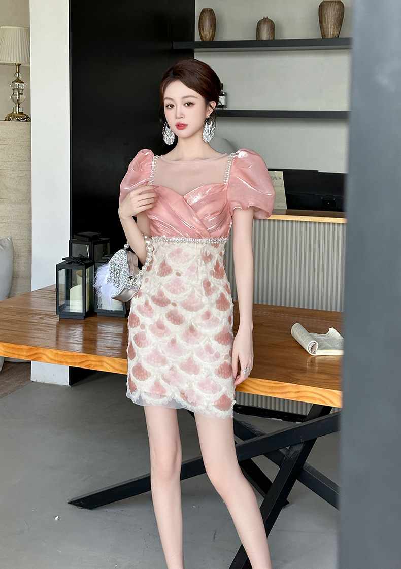 C-3359# 法式设计感亮片粉色小礼服裙夏季女名媛气质显瘦包臀连衣裙21240