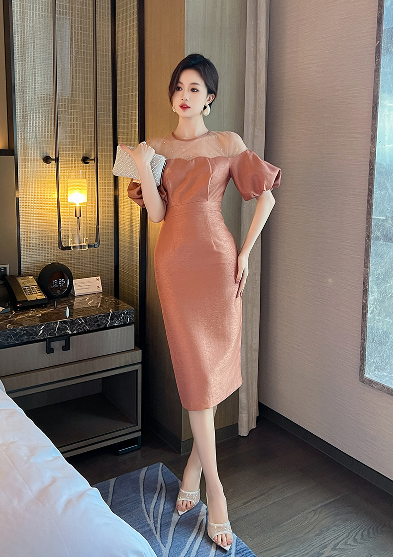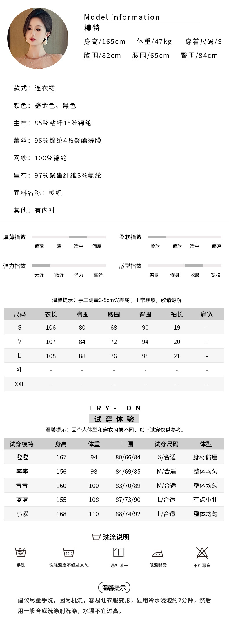 C-3456# 黑色晚礼服2024夏季新款名媛气质网纱拼接泡泡袖修身连衣裙21312