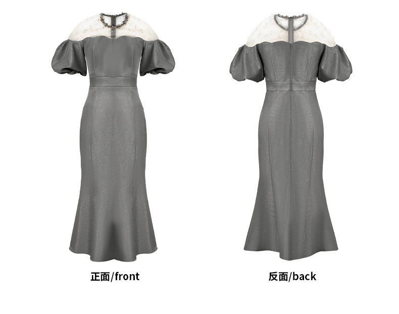 C-3462# 2024夏季新款女装性感网纱拼接泡泡袖收腰鱼尾长款连衣裙21349