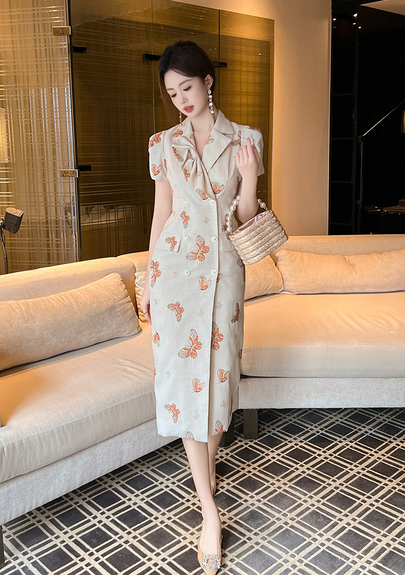 C-3520# 广州2024夏季新款女装时尚印花西装翻领显瘦包臀短袖连衣裙51088