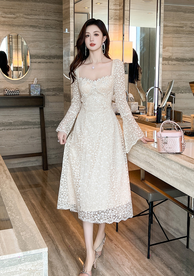 C-3584# 2024秋季新款女装法式方领收腰花瓣蕾丝长袖连衣裙过膝长裙9805