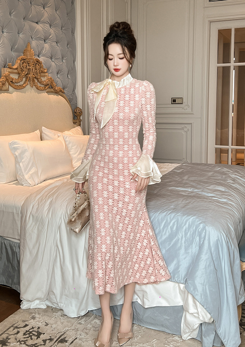 C-3611# 2024秋冬装新款女装甜美气质减龄蝴蝶结修身显瘦鱼尾连衣裙11365