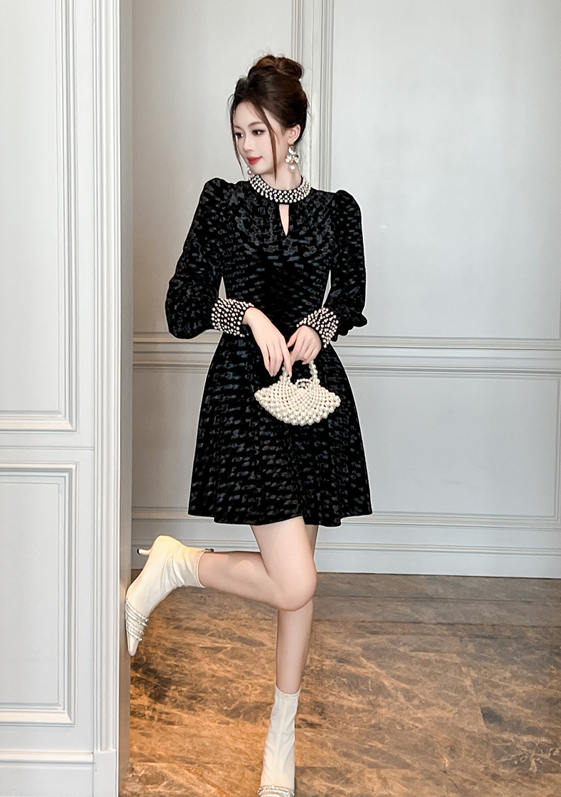 C-3617# 赫本风黑色丝绒长袖连衣裙女秋季富家千金风重工气质a字裙子40628