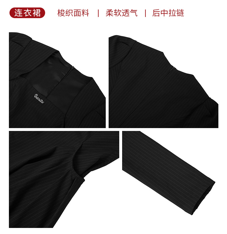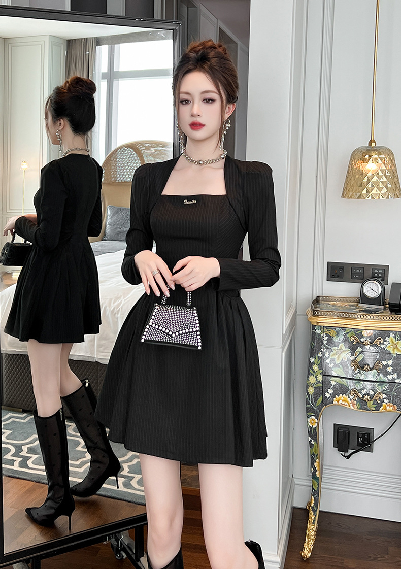 C-3622# 2024秋冬装新款女装法式方领条纹连衣裙纯欲收腰显瘦小黑裙21523