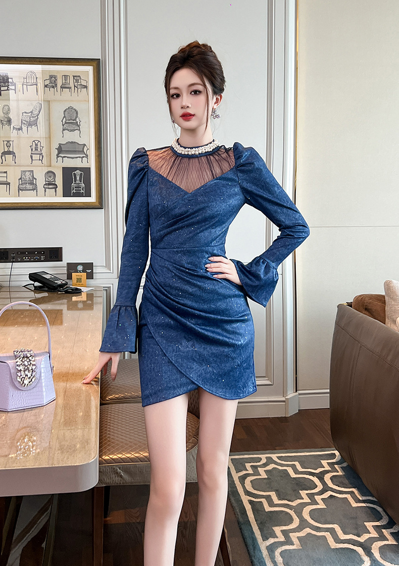 C-3626# 辣妹性感连衣裙女秋季2024新款重工钉珠褶皱修身包臀短裙子91349
