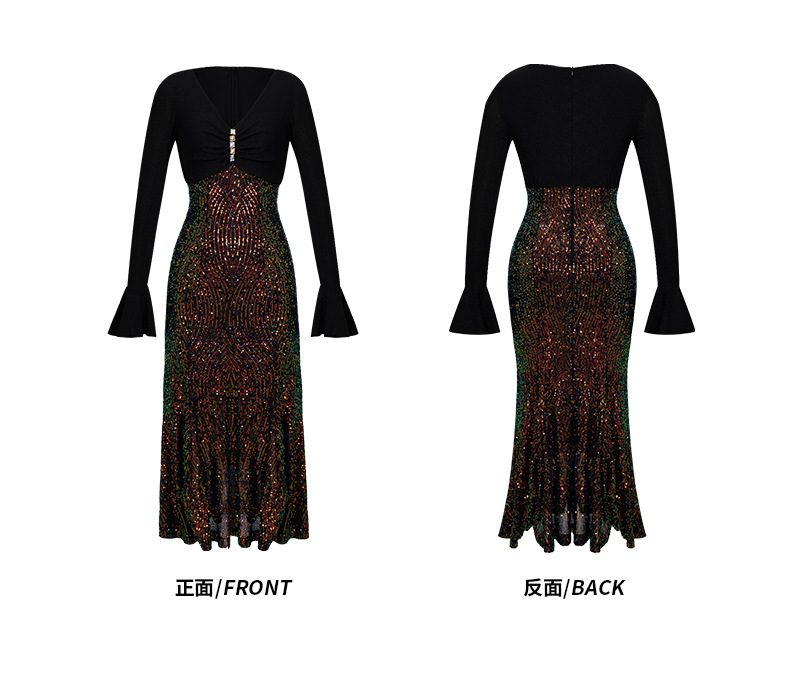 C-3628# 年会晚礼服2024秋冬装新款法式V领喇叭袖修身鱼尾亮片连衣裙91375