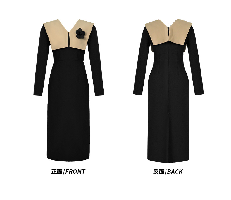 C-3632# 2024秋冬装新款女法式大翻领撞色拼接修身包臀一字步连衣裙21519