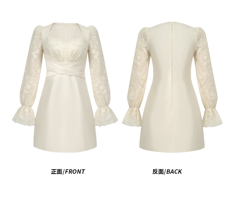 C-3643# 2024秋冬装新款女法式方领设计感蕾丝拼接喇叭袖显瘦连衣裙21451