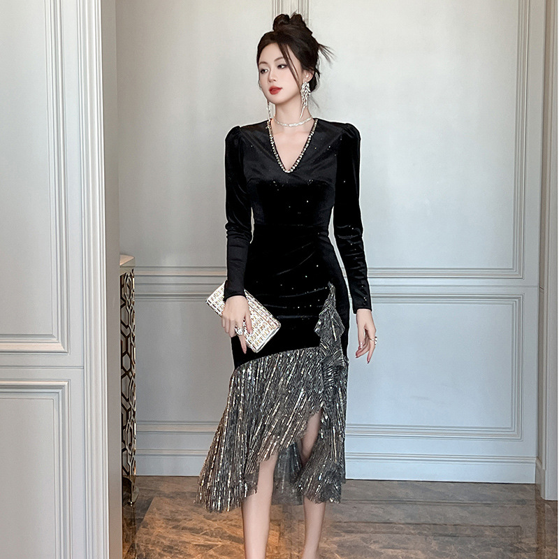 C-3709# 年会礼服裙2024秋冬装新款女装法式V领修身显瘦不规则连衣裙21528