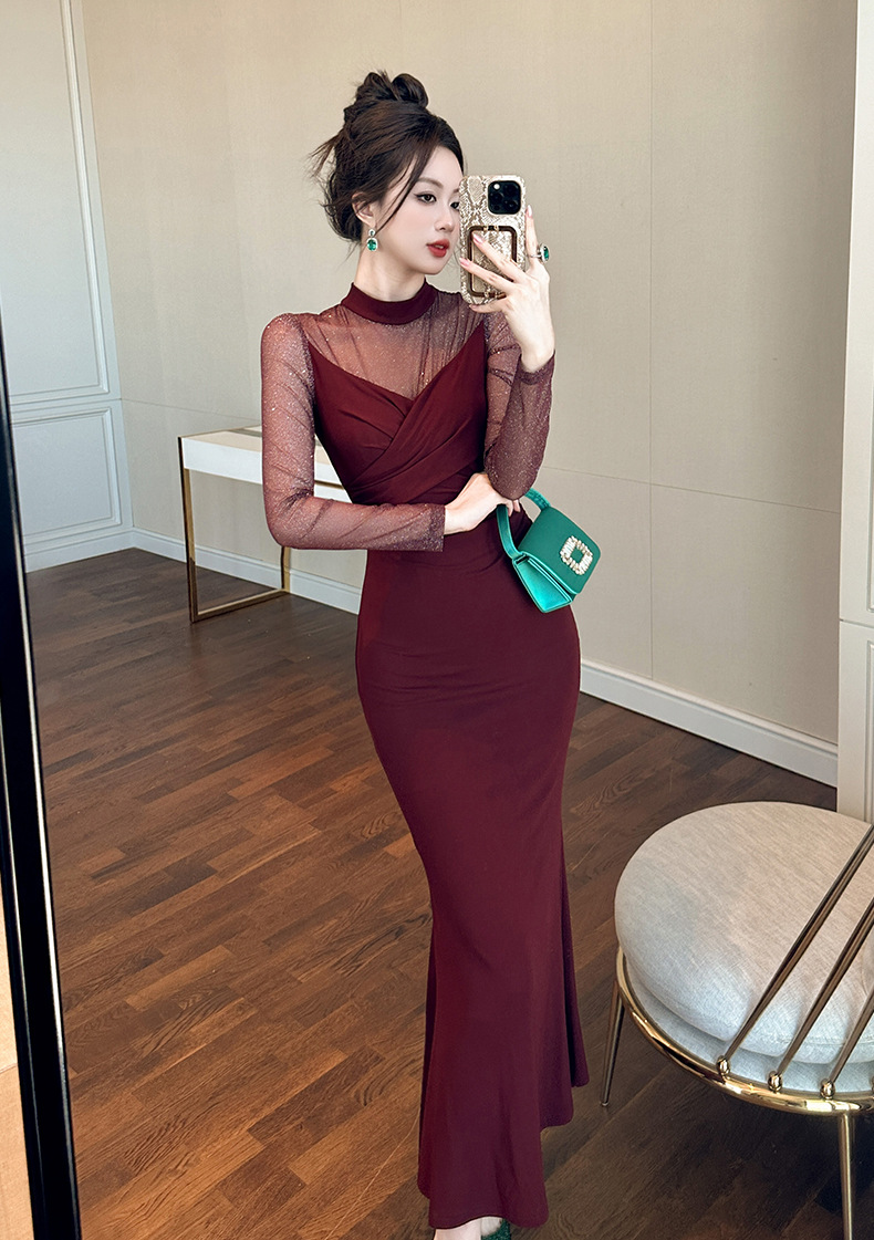 C-3713# 2024秋冬装新款女装性感纯欲风气质网纱拼接修身包臀连衣裙80407