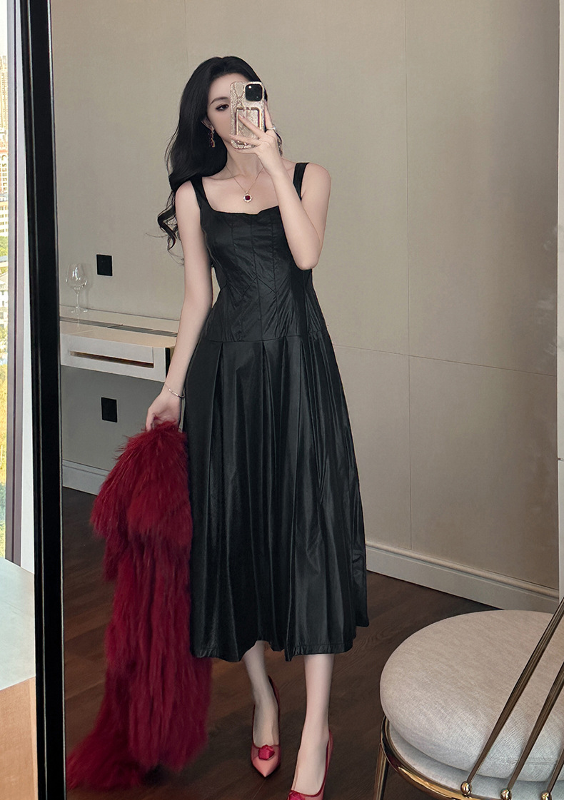 C-3721# 2024秋冬装法式气质收腰显瘦长款吊带皮裙外搭无袖黑色连衣裙9798