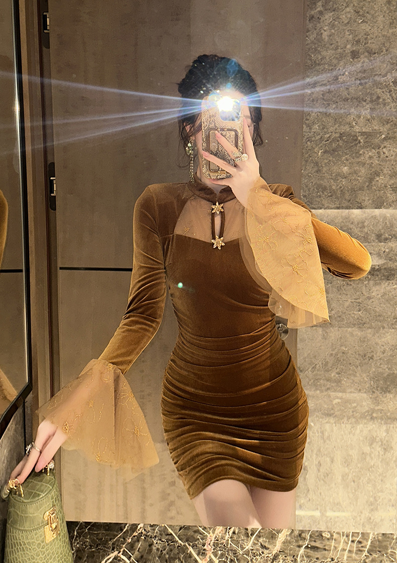C-3846# O-1604# C-3846# 2025春装新款女装新中式设计感修身改良旗袍喇叭袖连衣裙15356