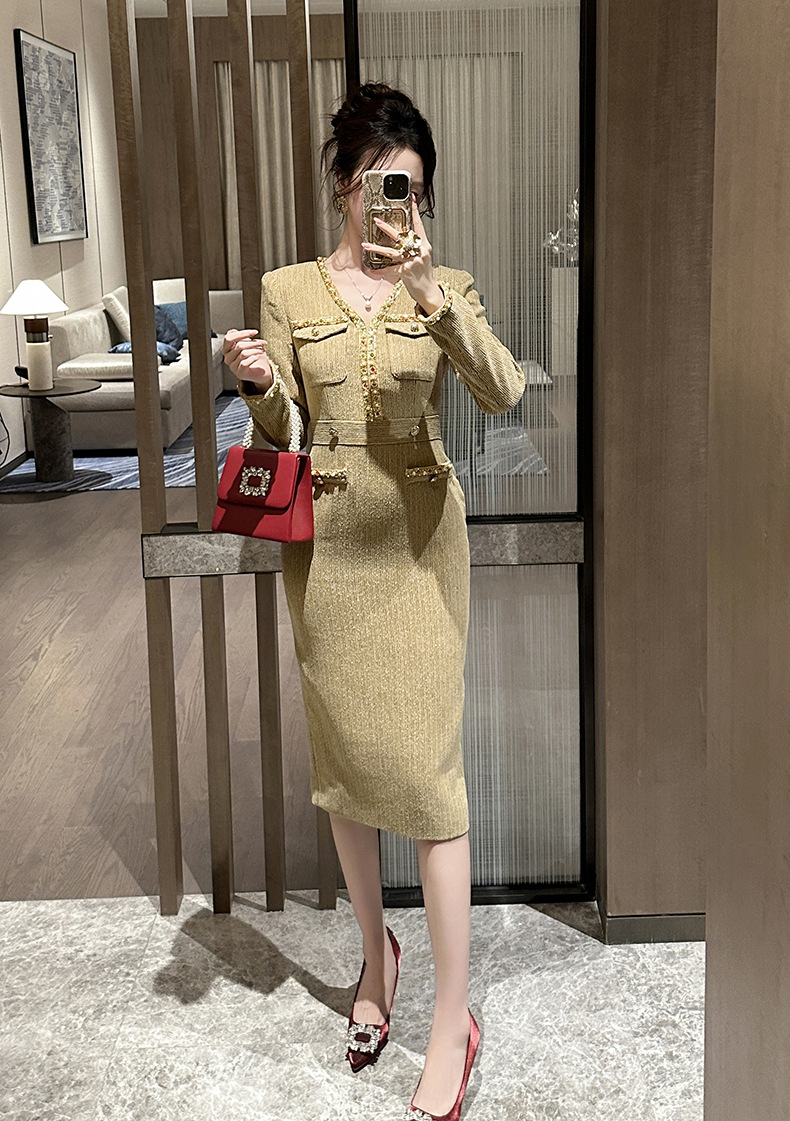 C-3859# O-1617# C-3859# 2025春装新款女装小香风气质镶钻V领修身过膝毛呢长袖连衣裙51231