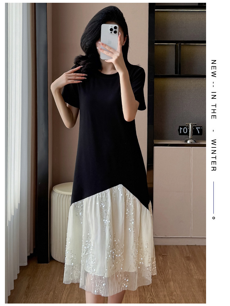 H-8193# 跨境拼接连衣裙2025夏短袖仙气飘飘亮闪闪网纱中长款大码T恤裙